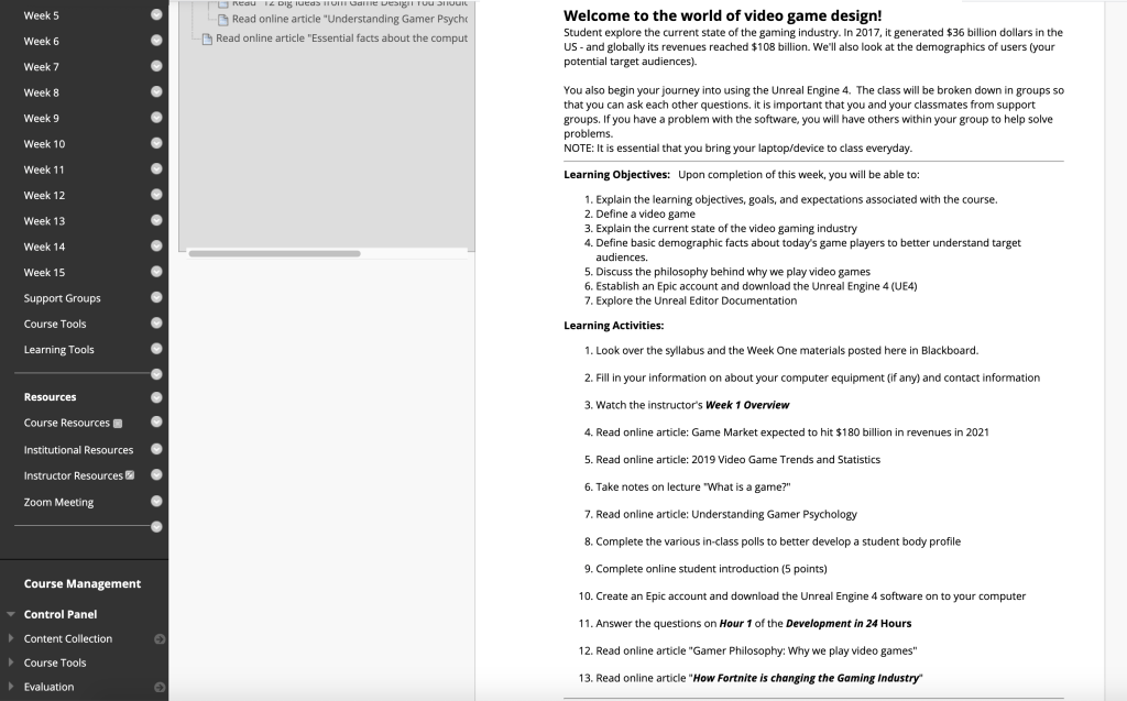 One of my strengths as an instructional designer is to take a course, any course, and design it with the student experience in mind. Please watch the video, below, to see several examples of learning experiences I created.